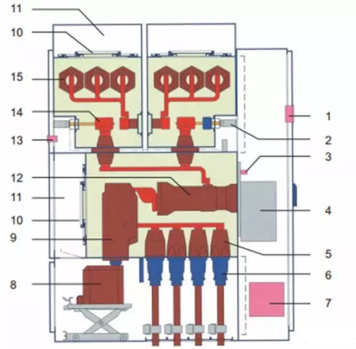 國內(nèi)則主要是西安森源聯(lián)合開發(fā)的GZX系列,額定電流在2500A及以下,其結(jié)構(gòu)如下圖:(目前市場上主要是側(cè)擴和頂擴,單氣室,雙氣室,三氣室的等)國內(nèi)代表性廠家主要有常州太平洋,寧波天安,正泰,順德開關(guān)等。