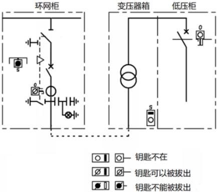 如圖7所示,環(huán)網(wǎng)柜內(nèi)部,隔離/接地開關(guān)與電纜室門之間的鑰匙聯(lián)鎖,電纜室蓋板打開后,鑰匙被鎖定,不能拔出插入到隔離開關(guān)鎖,即不能操作接地開關(guān);只有蓋板合上,鑰匙才能拔出,去操作接地開關(guān)分閘。而系統(tǒng)角度,只有接地開關(guān)合閘,鑰匙才能被取出,去開變壓器箱的門,實(shí)現(xiàn)變壓器檢修,同時(shí)低壓斷路器不能合閘。