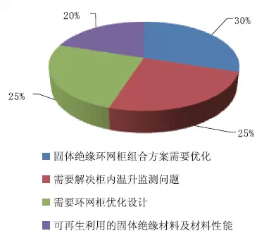 在固體絕緣環(huán)網(wǎng)柜設(shè)計中,認為亟待解決的問題具體有以下內(nèi)容,認為固體絕緣環(huán)網(wǎng)柜組合方案需要優(yōu)化的占比30%;需要解決柜內(nèi)溫升監(jiān)測問題的占比25%;需要環(huán)網(wǎng)柜優(yōu)化設(shè)計的占比25%;可再生利用的固體絕緣材料及材料性能的占比20%。如圖10所示。