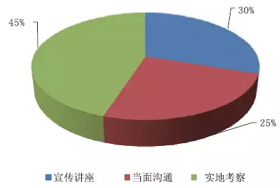 通過了解參與者了解新產(chǎn)品知識的途徑,認為最有效的方式中:宣傳講座的占比30%;可以通過當面溝通的占比25%;可以參與實地考察的占比45%。如圖16所示。