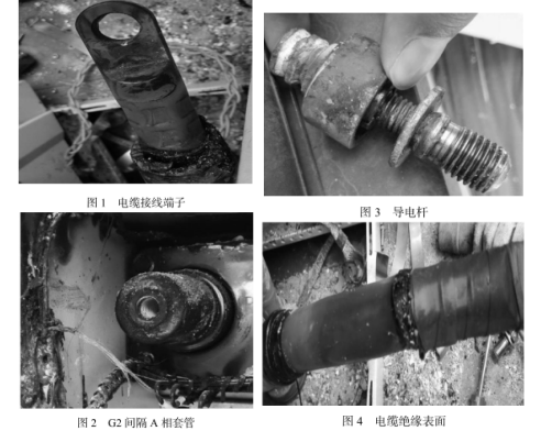 搶修人員對G2間隔電纜拆除后,發現電纜接線端子(如圖1所示)氧化嚴重,說明此處遭受過高溫侵蝕,并且應力錐靠近端子處的燒蝕痕跡也說明了插頭受高溫侵蝕;現場發現端子與環氧套管銅件的接觸面存在明顯氧化,說明高溫侵蝕時,端子與環氧套管銅件表面并未完全緊密貼合;檢查套管內部螺紋亮光正常(如圖2所示),說明導電桿安裝緊固。環氧套管遭受高溫痕跡明顯,且銅件表面與端子接觸面也有很明顯氧化痕跡,說明在高溫發生時,端子與環氧套管銅件表面并未完全緊密貼合;現場對導電桿(如圖3所示)進行檢查,發現變徑螺桿氧化,以及銅嵌件脫離環氧,熔融附于變徑螺桿上,都說明此處經受過高溫傳導;對電纜應力錐剝除后,發現電纜絕緣表面(如圖4所示)無明顯爬電痕跡,說明應力體部位未發生爬電故障,從絕緣受高溫侵蝕和燒蝕判斷,高溫來自端子部位。
