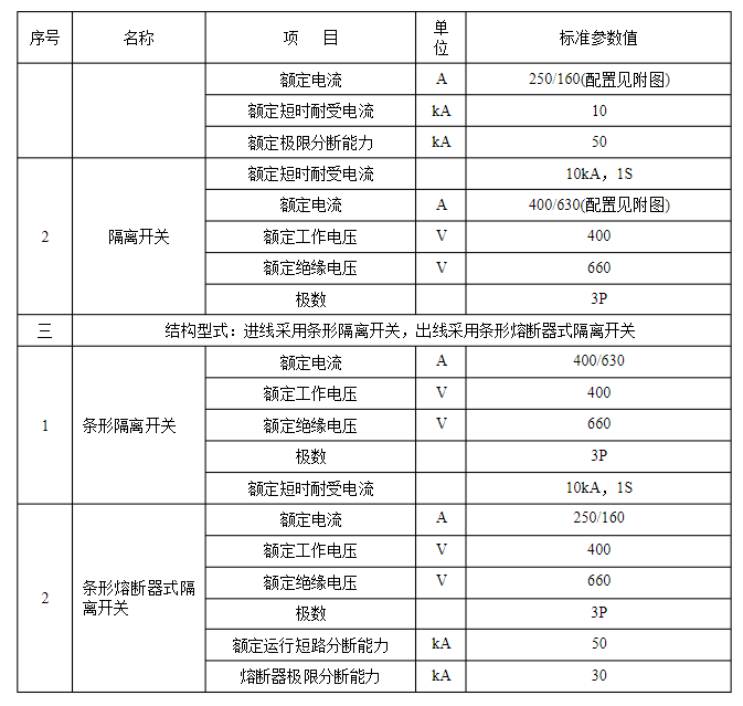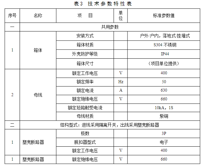 2.3.11在使用中可以互換的具有同樣額定值和結(jié)構(gòu)的組件,應(yīng)具有互換性。?3?規(guī)范技術(shù)參數(shù)?技術(shù)參數(shù)特性表是對(duì)收購(gòu)設(shè)備的基礎(chǔ)技術(shù)參數(shù)要求,供貨方應(yīng)對(duì)技術(shù)參數(shù)特性表中規(guī)范參數(shù)值進(jìn)行呼應(yīng)。低壓電纜分支箱技術(shù)參數(shù)特性見表3