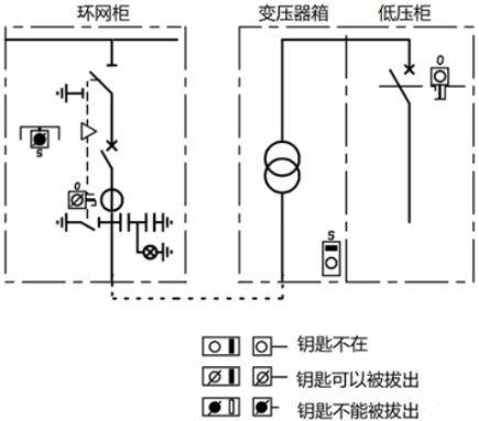 如圖7所示,環網柜內部,阻隔/接地開關與電纜室門之間的鑰匙聯鎖,電纜室蓋板翻開后,鑰匙被鎖定,不能拔出插入到阻隔開關鎖,即不能操作接地開關;只要蓋板合上,鑰匙才干拔出,去操作接地開關分閘。而體系角度,只要接地開關合閘,鑰匙才干被取出,去開變壓器箱的門,完結變壓器檢修,一起低壓斷路器不能合閘。