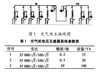 變電站位于高原地區(qū),海拔2100m。變電站選用某公司生產(chǎn)的35kV中壓氣體絕緣開關(guān)設(shè)備。主接線如圖1所示,其中電壓互感器型號為JDZx-35(A、B、C)型,具體參數(shù)如表1。