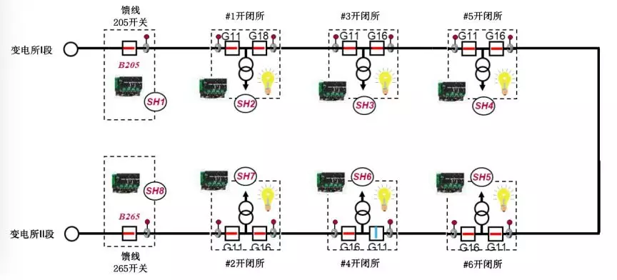 而通過在環(huán)網(wǎng)進線負荷開關(guān)柜布置T300的自愈方式,將能夠?qū)崿F(xiàn)更低成本的環(huán)網(wǎng)自愈。具體而言,在機場飛行區(qū)供電網(wǎng)絡(luò)建設(shè)中,變電站兩路出線帶若干個開閉所組成一個環(huán),變電站外出線隔離站及每個環(huán)網(wǎng)站節(jié)點各配置一臺T300裝置,以對等通訊方式實現(xiàn)“故障區(qū)段自動定位”、“故障區(qū)段自動隔離”、“非故障區(qū)段自動恢復(fù)供電”,使供電網(wǎng)絡(luò)故障實現(xiàn)全自動化快速處理,約30秒內(nèi)實現(xiàn)故障的快速切除以及恢復(fù)送電,達到世界一流的配電自動化水平。