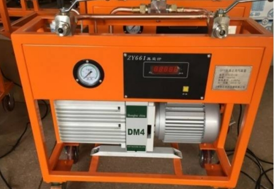 4)最有用最專業的方法,是SF6抽真空補氣設備,單級旋片泵極限真空度能夠抵達10Pa,雙級旋片泵理論極限真空度可抵達6.2*10-4pa,但是流量不大于100m3/h;
