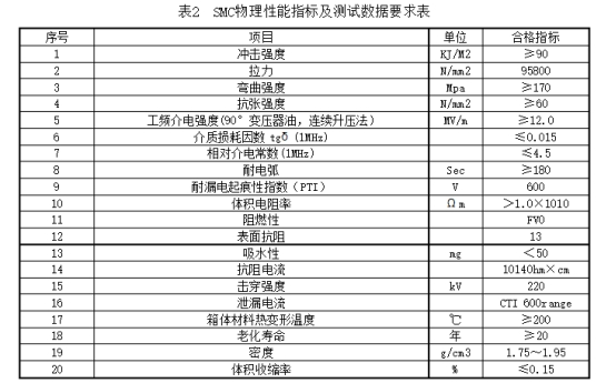 2.3.1分支箱外殼選用S304不銹鋼資料,箱體、門體資料厚度均不應(yīng)小于2毫米,或SMC復(fù)合資料箱體,SMC物理功用方針及測試數(shù)據(jù)滿足表2的要求。