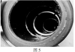 事端分支箱電纜終端所運用的硅脂密封功用不良,故障產生后,當拆撥其它兩相電纜頭時,因為硅脂呈現干枯粘結(如圖5),需求多人合力才調撥出,可見硅脂已不能起到潤滑防潮與絕緣的作用,不能與電纜頭同呼吸,彈性功用大為下降。