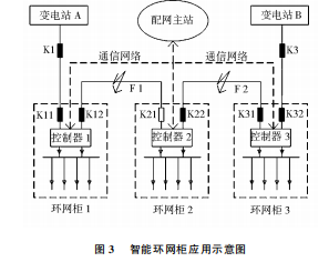 的區(qū)段,兩邊都能或者都不能檢測到故障信號的區(qū)段則不是故障線路,所以可快速容易的將故障點定位在K12和K21之間。開關(guān)K12會跳閘,開關(guān)K21保持分閘狀態(tài)并閉鎖,將故障區(qū)段切除。配網(wǎng)主站接收到隔離成功信息,通過調(diào)度自動化系統(tǒng)將開關(guān)K11合閘,恢復非故障區(qū)域供電。同理,當在F2處發(fā)生故障時,集中式智能控制器將采集到的故障信號傳輸?shù)脚渚W(wǎng)主站,配網(wǎng)主站對故障信號進行分析和邏輯判斷。通過故障點處在兩邊感受到信號不通的區(qū)段的判據(jù),將故障定位在K22和K31之間。開關(guān)K3會跳開然后自動重合,開關(guān)K31、K22跳開后不再閉合,將故障區(qū)段切除。配網(wǎng)主站接收到隔離成功信息,通過調(diào)度自動化系統(tǒng)將開關(guān)K21合閘,恢復非故障區(qū)域供電。在整個過程中,從發(fā)現(xiàn)故障到故障隔離最后將非故障區(qū)域恢復供電所需要的時間非常的少,能夠最大限度的提高供電的可靠性,這是采用智能環(huán)網(wǎng)柜的優(yōu)越性所在