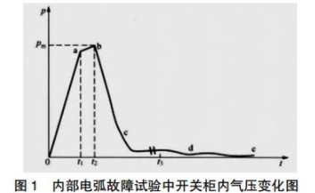 內(nèi)部故障產(chǎn)生的損壞力與電弧產(chǎn)生的間隔容積,電弧電壓,持續(xù)的時(shí)間,短路電流大小有關(guān)。在電弧產(chǎn)生后,柜體內(nèi)的壓力進(jìn)程如圖1所示,壓力進(jìn)程可以分為四個(gè)物理階段如圖1。